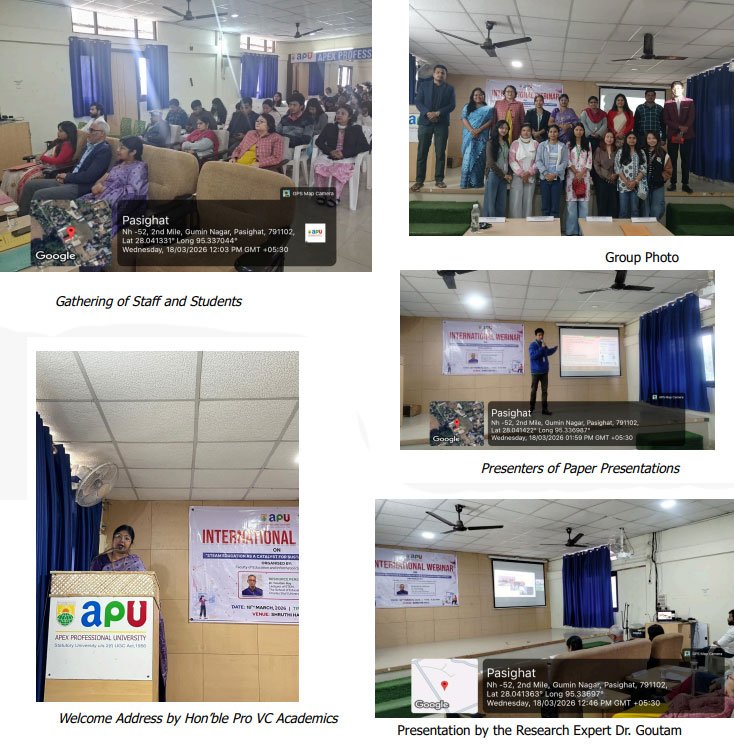 The Faculty of Education and Information Science, Apex Professional University, Pasighat, organized an Online International Webinar titled “STEAM Education as a Catalyst for Sustainable Development” on 18th March 2026 in hybrid mode. The event aimed to explore the role of STEAM education in achieving sustainable development goals, promoting interdisciplinary learning, and encouraging innovation and research aligned with global sustainability frameworks.